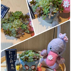 こんにちわ🙌 今日はもう一枚〜🎶 植えつけ祭りです🎶 久々のpeanyats鉢には一緒に来たコブエケちゃん✨ えつこさんのクジラ鉢には群生ちゃん🍀 大好きなマジックジャムゴールドは2個狩りしましたが一つにしてモリモリに植えました✨ ドングリタンが見守り隊🫡✨ 安定の頭巾タンズとクリトゥマトゥピータンは定位置🤣 ピータンBOXも整頓しました🤭💕 多肉ごとも楽しいけどピータンを選んで並べるのも楽しい時間🎶