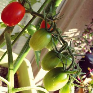 ミニトマトの実が一部赤く色付きました。他のはまだ青いので赤く熟した3つだけど収穫しました☺️ テレビでは房ごと赤くなっているのを見かけますが…なかなか全部一緒には赤くなってくれません🤣 今日もかなりの暑さです🥵 ミニトマトも葉っぱがだいぶだらりとなってて可哀想です😥お昼前には日陰になるこのベランダも壁側で32,7℃で、トマトの位置では34,3℃ありました。(午後0時30分) この夏は高温障害で農家さんも大変のようです😱