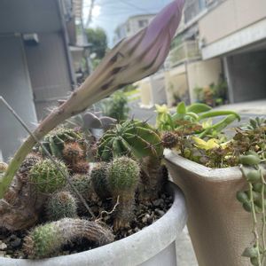 サボテンタンゲマルの花が今年も咲きました。梅雨に入り毎日の雨で、花が落ちないようにガレージに避難。首が折れないように紐で釣ってます💓全部で6個咲きました