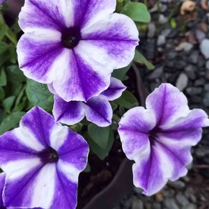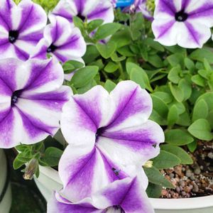 こんばんは。 今日花達の手入れしていて、なにげなしに「ペチュニア ブルーベリージャム」と「サフィニア るりいろ風ぐるま」を並べたら・・・ そっくりさん💜 葉っぱ🌱の形は違うけどここまで似てるとは ペチュニアの方は若干霜降り?だけどね(笑) それと、「サフィニア あずきフラッペ」が「ももいろハート」のような模様になって「あずき色ハート?」になっているのもあります(笑)