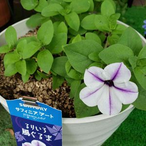 空いている鉢にサフィニアを植えました ❀.(*´▽`*)❀. 風ぐるまの様なお花です♥♥