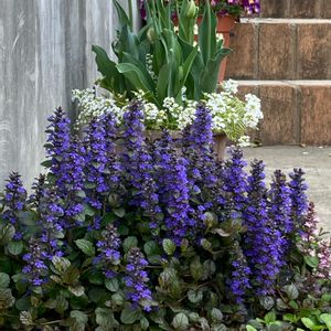 アジュガ 玉竜と入れ替えてココで開花 上へ上へと伸びている 右にチラリとピンクちゃん 今年はアジュガを色々と整理してみました