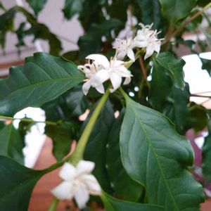 鉢植えのコーヒーの木。 コーヒーの実からと双葉の苗から育てて21年目です。今は3本になってしまいました。 コーヒーの花です。部屋に入るといい香りがします(^-^)