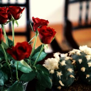 テーブルの上。案外、バラとサボテンの相性が良くて安定感があります。