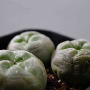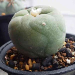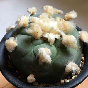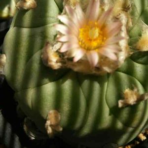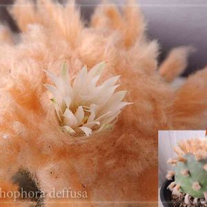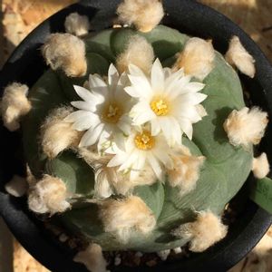 ロフォフォラ・デフューサに花! 先端のもこもこの中に埋もれるように咲いているので、つぼみを付けたのも知らなかった……。