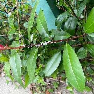 質問です。 ベニカナメモチ(?)の枝に付いている白いものは何ですか?虫?病気?