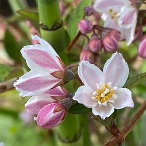 2022,4,17 9:07撮影 隣街の花壇 去年見つけたサラサウツギ 花壇の改修で無くなったかと思ったけど 残しておいてくれた。 サラサウツギの一重は珍しいのよとこの花壇を世話する人に話しておいたからかな💕 サラサウツギは八重ばかりなので一重を作ってもあまり評価されないと園芸家さんが嘆いてた💦 雄蕊が繋がってるのがウツギの特徴とか。花弁の外側がピンク色内側が白 一重だと内側からもピンクが透けてる こんなに美しい花なのに この花の良さが認められます様に🙏