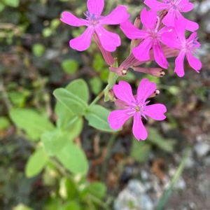 2022,5,23. 7:34撮影 歩道横のユリノキの下に咲いてた花 少し前に、建物の通路入り口の車止めバリカーに3ヶ所咲いてた。花弁の先が桜の様にくぼんでるので桜草?と思ったけど、今日みると葉の形が野草ぽい 何の花かな? 皆さんからムシトリナデシコと教えていただきました。 ありがとうございます😊
