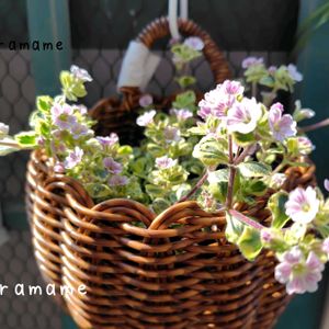 唐辛子さんがいたカゴ🧺にinされた 新入りさん✨ 見た瞬間ドキュン💘 カーペットかすみ草 と言うんだって😲 初めて知りました 這って成長するので、ハンギングやグランドカバーにオススメだそう 写真撮ってるときも、良い香りが風に乗って🌿 ベランダのお花たちが、私を見て〜って言ってるみたいです😆