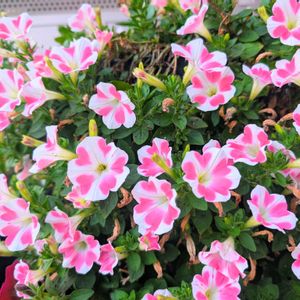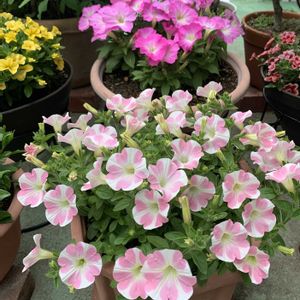 サフィニア ももいろハート 花がらがハート模様のペチュニアです。 今年は1株を10号鉢に植え付けて育ててます。 1回ピンチして追肥をひたすらしています。 花は休まず咲き続けており見応え十分です。