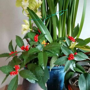 おはようございます(*^^*)🍀 庭の千両です😊お隣さんと友達にもお裾分けです💕 黄色い千両は鳥に半分食べられ少ないです😆 毎年恒例でヒサカキと一緒に☺️