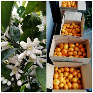 こんにちは(*^^*)🍀 今日のお花ミカン🌼 探したら見つけたので、先日収穫したミカンの実とコラージュしました🍊