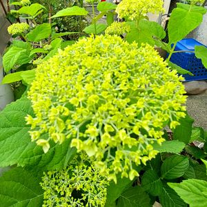 おはようございます(^-^)/ 小雨が~🌂これから治療の為!病院まで🚶‥。 1️⃣アナベル 2️⃣3️⃣お向かいさんのスモークツリー 4️⃣ダリアとバーベナ(ビジョザクラ) 5️⃣ダリア(黄色) ☆穏やかな一日であります様に🙏🩵💜🤍🧡❤️💚🩷💛