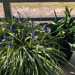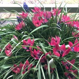球根ポイポイ鉢 原種チューリップとムスカリが満開です。 ボサボサ💦
