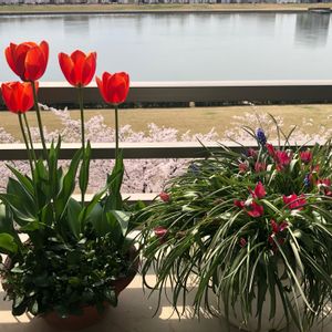 🌷原種チューリップ・リトルビューティー🌷 咲いて来ました✨ 満開のソメイヨシノ🌸をバックに。