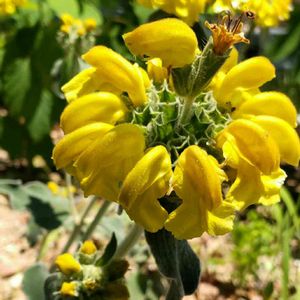 エルサレムセージの花 鮮やかな黄色い花 厚みのあるベルベットのような葉 常緑低木で、花の終わったあとのボール状になったガクがドライフラワーに使える 「はじめまして」の花でした🎵