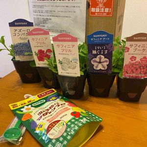 こんばんゎ♪(,,• •,,)☆ モニター当選花苗♡ [サンフラアンバサダー2022] サントリーフラワーズ公式アンバサダー♡ 夕方からみどりのまとめに投稿を…… 何度試しても投稿公開にならず😫😅 何度やった事か😂😂😂 泣ける~~~😫😆😂 どうした事でしょう😄 何がいけないのか……? 諦めてタイムラインに投稿させて頂きます😌 サントリーさんから届きました花苗を昨日早速鉢植えを……😊 ハイポネックスさんの肥料を混ぜ混ぜ~~~♬♪♪ 花苗のご紹介させて頂きますねぇ😌 *左奥→サフィニアアー(るりいろ風ぐるま) *右奥→サフィニアアート(ももいろハート💟) (こちらはおまけ苗) *左手前→サフィニアブーケ(小梅ちゃん) *サフィニアフリル(ホワイト) *サフィニアフリル(ピンク) おまけ苗と肥料♡ ╋サフィニアアートももいろハート💟 ╋ハイポネックス殺虫剤成分入りの肥料 一石二鳥ですねぇ😄✌️ おまけが嬉しくて……٩(๑>∀<๑)۶ サフィニアフリルのホワイトとピンクはハンギングバスケット敢えてミックス植えに……♡ どんな風に咲いてくれるか今から((o(´∀`)o))ワクワク💓💓 楽しみながら生育の様子をお届けしたいと思います♡ どうぞ宜しくお願いします (*´╰╯`๓)♬