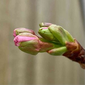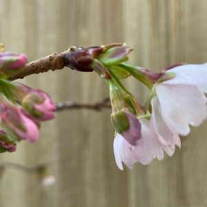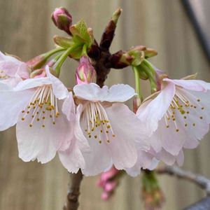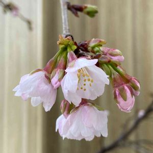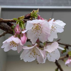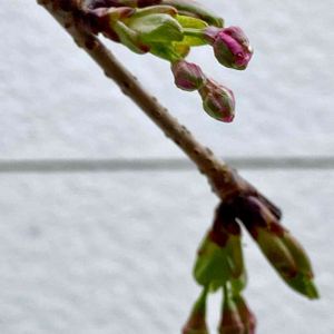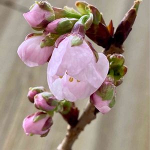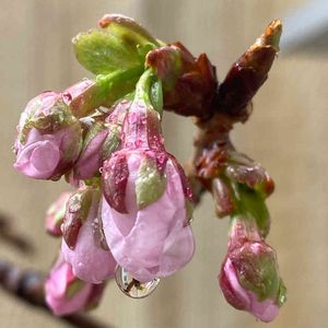 寒緋桜です。 花は下向きに半開の鐘状に咲いています。