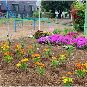 朝の散歩 🐶🐾ᵕ̈ ボランティアさんの花壇 🌸🧡🌼💛🌿 🌷 チュウリップから🧡マリーゴールドへ ݁₊˳✿⏦۠₊༘⋆✿ ❀✿𑁍.ೃ࿔*