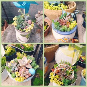 冬にやられた多肉さん達も復活しだしたので 寄せ植え制作中。 普及種ばかりですがそれなりに気に入ってます。 私の寄せ植えは流木がシンボルにしてましたが拾いにいけれずフィギュアで穴埋め💦 地元良心市で徐々に売れだしてきてます🎵