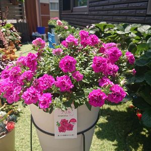 おはようございます‼️ いい天気です😃 サントリーフラワーズ公式アンバサダー第1弾のサフィニア フリル ピンク🎵 略して「フリピン」⁉️ この子はまだ切り戻してません😁 右側がやや高さあるかな~😃 切り戻せばまんまるになってくれそう🎵