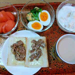 ブレックファースト🍴 🍅🍌🥦🥚☕ カロリー計算しないけど 赤 緑 黄 白 茶 色を意識して バナナはヨーグルトかけて 🍞はチーズと煮豚乗せて ブロッコリーはマヨネーズ焼き