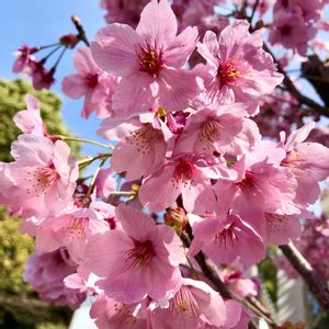 東京は🌸桜の開花がニュースになりましたね。 そうよ、そうよ、グラウンド周りの桜! いつも早いもん、きっと 咲いているはず💕💕と思い、 仕事終わりに駆けつけました。 夕陽を浴びて光っていました🌸🌸 これはソメイヨシノではないのはわかるのですが 河津桜なのでしょうか。