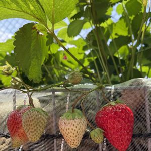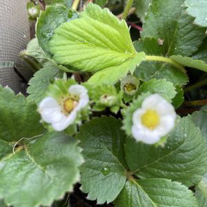 暑いですね🌱晴れ☀️29℃湿度63% いちごからライナーが伸びて花と実をつけています🍓 粒は小さく、液肥と土壌を改良しなくては🤔