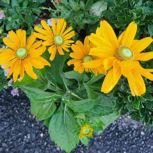 こんにちは👋😃 雨が、上がり 暑い夏に、なりました。 ルドベキアの苗が、道の駅かなんで、5苗買いました。 花は、小ぶりですが、 元気を、もらえました。 7号鉢に3苗寄せ植えました。 明日、長男の家に、届けます。 我が家は、残り2苗を、ユーカリポポラスと、寄せ植えました。