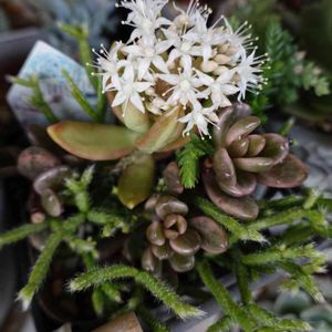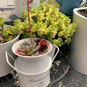 おはようございます☀️ 寄せ植えの中、銘月の白いお花が咲いた❤️ 今週も仕事が忙しい一週間です😌 最近は寝室からベランダの多肉ちゃんを眺めてから起きる毎日でした💕