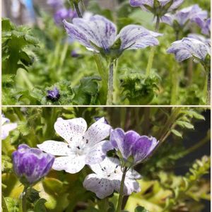 今年のネモフィラの種撒きっ子たちは、 愉快で楽しい。 またまた、ニューフェイスです。 咲いた時に真ん中が💜は、ブルーアイズ。 でもこれは、外側に色が入っていて、 蕾の時が、💜です。 ブルーアイズの変異種でしょうか? それとも、スノーストームの……? ネモフィラに詳しい方、教えて下さい。