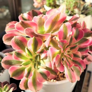 週末、ヤフオクに挑戦して落札できたピンクウィッチ💓 とても欲しかったので5株のセットを落札したけど、先程届いた箱📦をワクワク開けたら、一株が両手を広げたくらいの大群生🤣🪴💓わお〜😍 慌ててYouTubeみながらカット、カット、カット💦 2つだけ、ブーケみたいにならないかなってクルッと一周残してみました🤭 うまくいくといいな☺️ 多肉初心者の私はアオエニウムも初心者😅 植えてキッチンで水やりしてたら、チラ見してくるパパが怖い😞 いいでしょ💦綺麗だから☺️ 満身創痍、頑張って外国から来てくれたこの子達🪴 元気に育ってね💓🪴☺️