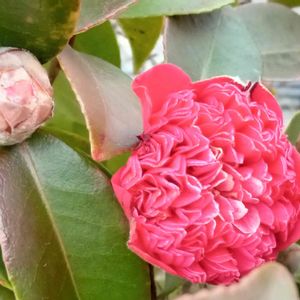 こんにちは😃 美しい紅色の椿です。 唐子咲きと呼ばれる咲き方。 紅唐子とか、紅卜伴とか呼ばれる花でしょう。 見た感じよりは小さな花です。 一番外側の花びらがしっかり開くと、唐子の名前らしくなりますが、こんなボール状のまま開かない花も多いです。🤔 同じような花で、真っ白な花もあります。 赤いものを日光(ジッコウ)、白いものを月光(ガッコウ)とも呼ぶようです。 このように、雄しべが花びらに変わってしまう理由が分かりません。 進化は不思議です。😅