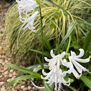 ダイヤモンドリリー🌻🐸🌵 初開花! 11月に咲く花は貴重。 昨年、売り場で 鉢植えでなくてむき出しなのに、 葉っぱやつぼみがついた球根? かなりお買得で、3個中2個💮 🏷️白い水曜日♡に参加します🎶