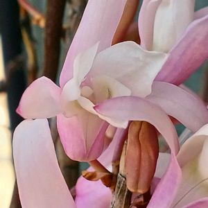 道側の枯れた楓に着けてある 石斛^ - ^ 前は葉が出ていました、しかし カミキリ虫にやられ楓が枯れてしまってからは 椰子の葉で日除け^ - ^ 野生種で超うすいピンクと白い株の石斛です^ - ^