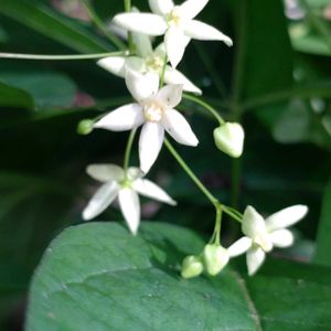 針金のような細い花柄の先に1センチ位の星型の花をつけます。 シロバナといっても薄黄緑色かな? 白花草薙尾苔 キョウチクトウ科 カモメヅル属 花期 5〜6月 分布 千葉以西 四国 九州