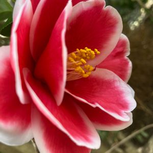 GS初めて直ぐから見せて頂いている 椿とカランコエの先生からいただきました 椿 タマ アメリカーナ… 白い縁取りと少し小さめの蕊が上品 焼けない様にちょっと木陰においていると より美しく感じる