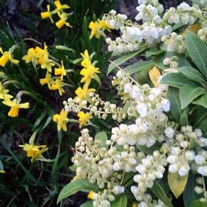 🤍馬酔木にミニ水仙🤍 植栽して15年位 雪で押し潰されたりで まだ腰の高さのあせび ♡今年は花付きが良いみたい♡ 裏庭に