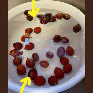 少し前に頂いた蘇鉄の実です。 直ぐに埋めちゃおうと思ったら、我が家のおじいちゃんが寒いと種が凍る?と言ったので念の為、植えるのをやめていました。 もう大丈夫だと言うので植えようと思ったら、暫くはお水につけてから植えた方が良いと言うのでつけることにしました。 その時、駄目な種は浮くと言うので見たら、本当に浮く種と沈む種がありました。 まっおじいちゃんの言う事を聞いて、暫くしたら植えてみます! 写真では、わかりにくいですよね。