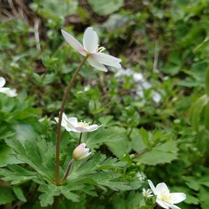 ニリンソウ(二輪草) キンポウゲ科 イチリンソウ属 4~5(6)月 15~25cm 在来種 多年草 根出葉は1~6個 3全裂し、側小葉はさらに2深裂するため全体に五角形状 小葉は広菱形〜倒卵形あるいは広倒卵形で長さ2~6cm、幅1~4cm、中裂~浅裂し、白い斑紋がある 葉柄は長さ6~25cm 花茎の先につく茎葉(総苞様)は無柄で3個輪生し、深く欠刻する 葉の表面に白い斑紋がみられる 花径1.5~2.5cm 普通2個の花をつけるが、1個や3個のこともある 花弁に見えるのは萼片で通常は5個であるが、4個、6個7個。。。のこともw😊 開花直前の花が可愛らしい🥰 ※ 画像5枚目は根出葉