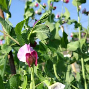 父の畑❇️❇️❇️ ①②エンドウのお花が可愛らしく咲いていました🌿💗🤍🌿 ③④⑤エンドウ豆も沢山ぶら下がっていました🎶🫛🫛🫛 お言葉に甘えていっぱい千切らせて貰いました😄🤭