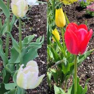 ひろちゃん農園さん行きつけの園芸店で特大球根もらった🧺 ノ-スポールは去年のこぼれ種で🌼 一番右下は水耕栽培で咲いたチュ-リップ🌷
