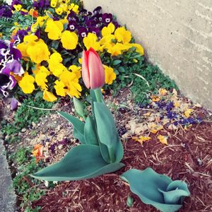 ピンクのチューリップと昨年種採ってたビオラ🌸 バラつきがあるけど大丈夫そう🎶 記録。
