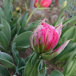度々登場の寄植え☘ダブルデッカーのチューリップが咲きました🌷 5球咲きそろう予定が真ん中の子だけ固い蕾のまま😅 できたら5球咲きそろって欲しかったです😗