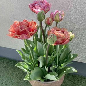 11月10日球根植え付け、4月6日から開花。 今は葉っぱだけで球根を育て中。 一斉には咲かなかったけど、代わる代わるで思いのほか長く楽しませてくれました。 アメイジンググレース(ピンク)とカッパーイメージ(オレンジ)の球根12個セットを6号鉢に花束植え。 球根たち、狭いかな? ちゃんと太れるかちょっと心配。 追記 5月9日 あまりにも葉に虫がつき、黄色い葉も出てきたので掘り上げ。 どの球根も植えた時より小さいのでゴメンナサイしました🙏