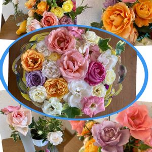 花手水ではなく花ボール(中心) バラアレンジから一週間 切り戻しを繰り返しながら 首が萎れてきたバラを 普段出番のないガラスの器に 浮かべてみました💕 最後に残った蕾達は左下の3つの花瓶に分けていけました❣️楽しみ尽くします😅 萎れた野菜が 40度で復活するのと同じで バラもお湯の中で シャキッとなるので バラ風呂🛀🌹💖と 思いましたが 流石に無農薬でないと 無理ですね🤗 🏷金曜ローズショー