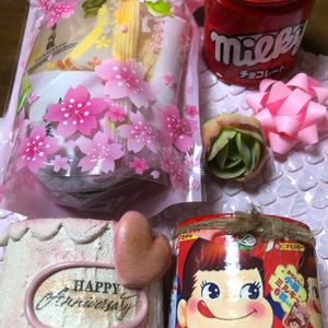 グランさんからありがとう便😍 コロンコロンのピーチブリデさん💕 ペコちゃんのリメ缶🥰 何が出てくるかワクワクの お菓子の詰め合わせ🤤 おまけにってサニコ師匠のリメ缶まで❣️ おまけのレベルではないっしょ🤣 姐さんありがとう😊😊😊