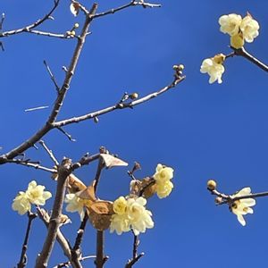 真っ青な空に映えるロウバイ 本当に綺麗でした 🏷花咲く乙女たち♡ 🏷雲仲間 🏷妖精図鑑 🏷ちっちゃいものクラブ 午後は曇天だったので お月様は無理? と思ったら輝いてました だいぶふっくらね🌓 月が切れちゃう!? コラージュしました🙏