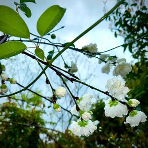 【万葉の中庭シリーズ:白い花桃編】 🌸白い花桃:White flowers peach 🍃ムベ:郁子の葉っぱ;Stauntonia hexaphylla Leaves 📝雨の中で濡れながら満開に咲いている白い花桃の花たちデス🐶 直ぐ傍には「ムベ:郁子」枝蔓が延びてきて🍃葉っぱついています。 【一首献上】 『雨に濡れ満開に咲く花桃や 傍に絡むはムベの枝蔓』 "White flowers peaches in full bloom while getting wet in the rain, It's beautiful that the branches and vines of Mbe are entangled next to it. 📝小雨の降る中でしたが、なんとも美しく💦雨粒が白い花桃の花を綺麗に見せてくれていました。 更に、枝木に絡んでいるムベ:郁子の蔓枝とその🍃葉っぱとのコラボが調和している雨中の光景に春雨の稀有な風情を感じましたデスら😸 🗒指でタップしながら拡大してよく観ると花に💦雨雫がたくさんついています。 ✍️Works: Poetaster Kazyan//筍歌人;藪中和堂 Artistic;White flowers peach Mar23,2023:past am 07:30’;📱shooting Mar23,2023:past am 08:45’;upload by Kazyan’s Green Studio