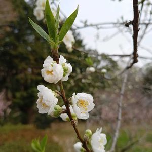 ハナモモ(花桃)バラ科モモ属 公園の白い花桃がやっと咲きました。 やはり昨年より二週間遅れてます。 2⃣後ろに見える淡いピンクは梅 濃いピンクはミツバツツジです。 花を観賞するために改良されたモモの園芸品種です。 中国原産で、サクラの仲間です。 花期はサクラとほぼ同じで、3~4月頃です 基本種は淡いピンク色の5弁花で、葉より先か葉と同時に咲きます 花の色は薄紅、濃紅、白、そして「咲き分け(源平)」と呼ばれるミックスカラーがあります 樹形には立ち性、枝垂れ性、ほうき立ち性などがあります。